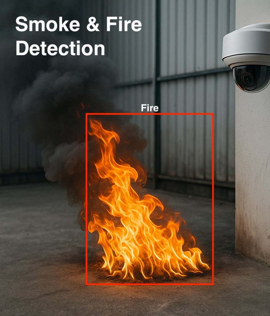 Common use cases include safety monitoring on construction sites, intrusion detection at restricted access points, fire and smoke detection in warehouses, people counting in retail environments, and fall detection in elderly care facilities.