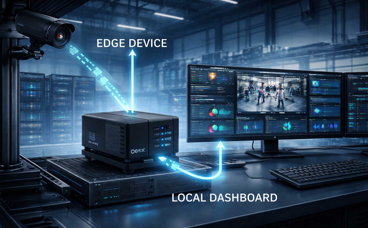 From an operational perspective, data usually flows from cameras or sensors to the edge device, where inference is performed locally. Alerts, events, or metadata are then transmitted to local dashboards or control systems, enabling fast response without exposing raw data externally.